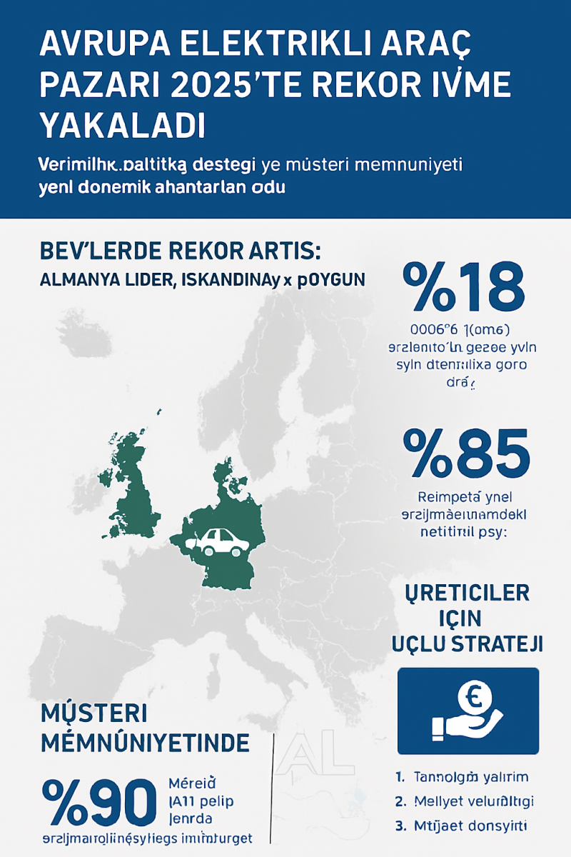 Avrupa elektrikli araç (EV) pazarı 2025’in üçüncü çeyreğinde tarihi bir dönemece girdi. PwC Strategy& tarafından hazırlanan “Elektrikli Araç Satışları Değerlendirmesi, 2025 3. Çeyrek” raporu, batarya teknolojilerindeki hızlı gelişmeler, müşteri memnuniyetindeki artış ve güçlü politika desteği sayesinde tam elektrikli araç (BEV) satışlarının rekor seviyelere ulaştığını ortaya koyuyor. Bu dönüşüm yalnızca otomotiv sektörünü değil; enerji, teknoloji ve altyapı alanlarını da yeniden şekillendiriyor.